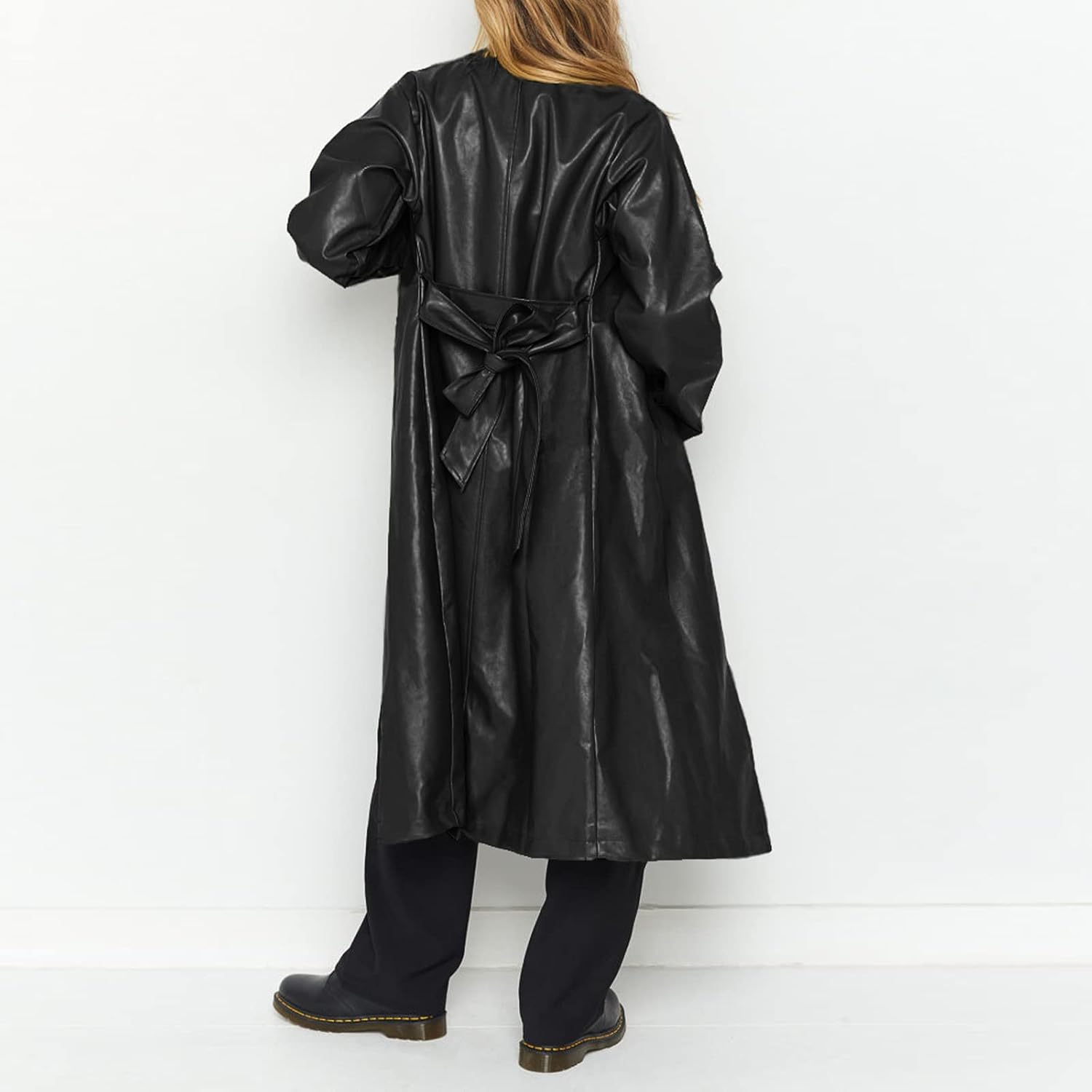 Crafted from high-quality PU faux leather, this trench coat is not only cruelty-free but also durable and easy to maintain. The lapel collar adds a touch of sophistication, while the open front design allows for easy layering and movement. The included belt cinches at the waist, creating a flattering silhouette and adding a touch of flair to any outfit.